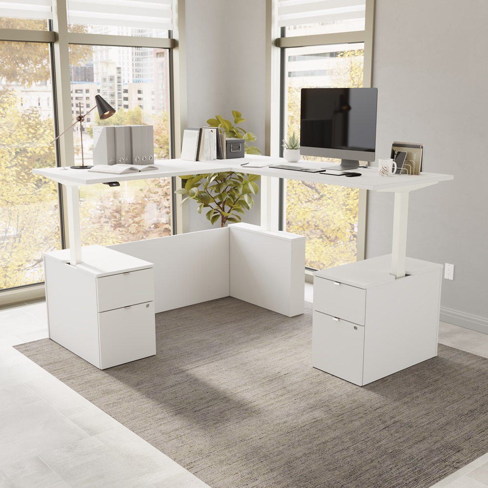 BBF Stratus 72" x 78" White w/ White Base Height Adjustable L Shaped Standing Desk with Drawers