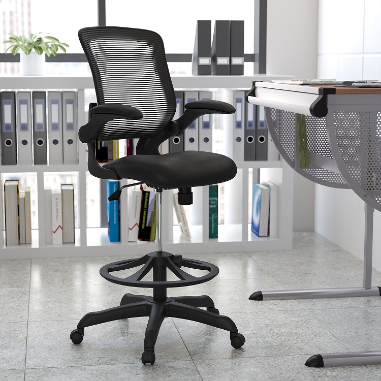 Flash Mid-Back Black Mesh Ergonomic Drafting Chair with Adjustable Foot Ring and Flip-Up Arms - BL-ZP-8805D-BK-GG